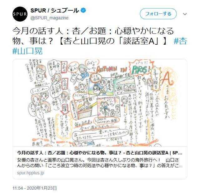 奇しくも1月23日に『SPUR』3月号が発売され、そちらには山口さんの描いた絵手紙が掲載される。そして、「前回の杏さんからの手紙は、本誌ウェブサイトSPUR.JPで読めます。」と、同日サイトに前回2月号に掲載されていた杏さんの手紙がアップされた。