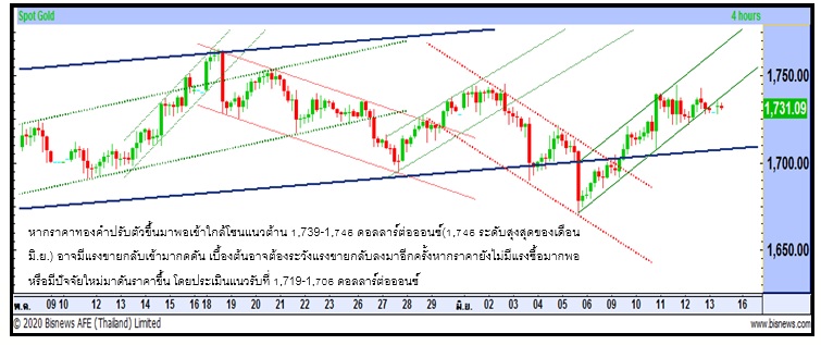 สรุป ราคาทองคำวันศุกร์ที่ผ่านมาปิดปรับตัวเพิ่มขึ้น 3.61 ดอลลาร์ต่อออนซ์ หลังจากในระหว่างวันราคาทองคำทะยานขึ้นไปทดสอบระดับสูงสุดบริเวณ 1,743.13 ดอลลาร์ต่อออนซ์ โดยได้รับแรงหนุนจากความวิตกเกี่ยวกับการระบาดของ COVID-19 ระลอก 2 ในสหรัฐซึ่งกระตุ้นแรงซื้อทองคำในฐานะสินทรัพย์ปลอดภัย ขณะเดียวกัน แนวโน้มที่อัตราดอกเบี้ยในสหรัฐจะอยู่ในระดับใกล้ศูนย์ต่อไปอย่างน้อยจนถึงปี 2022 เป็นอีกปัจจัยหนึ่งที่สร้างสภาพแวดล้อมเชิงบวกให้แก่ทองคำ เนื่องจากช่วยลดต้นทุนค่าเสียโอกาสในการถือครองทองคำซึ่งเป็นสินทรัพย์ที่ไม่ได้ให้ผลตอบแทนในรูปแบบของดอกเบี้ย