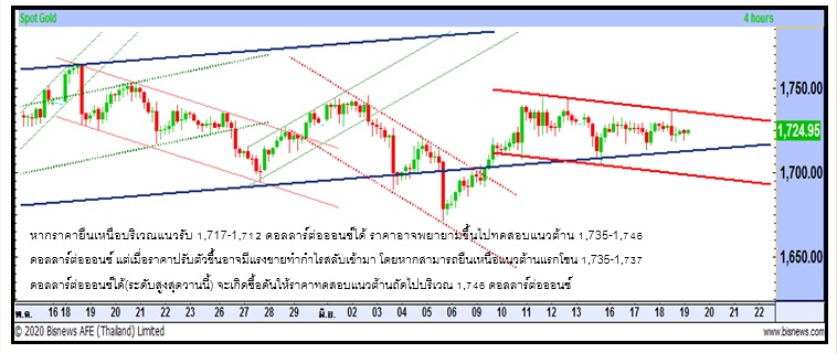 คำแนะนำ หากราคายืนเหนือ 1,717-1,712 ดอลลาร์ต่อออนซ์ เปิดสถานะซื้อเพื่อลงทุนระยะสั้น(ตัดขาดทุนหากหลุด 1,700 ดอลลาร์ต่อออนซ์) แต่หากราคาทองคำดีดตัวขึ้นยังไม่สามารถยืนเหนือ 1,735-1,746 ดอลลาร์ต่อออนซ์ อาจพิจารณาทยอยปิดสถานะซื้อเพื่อทำกำไร