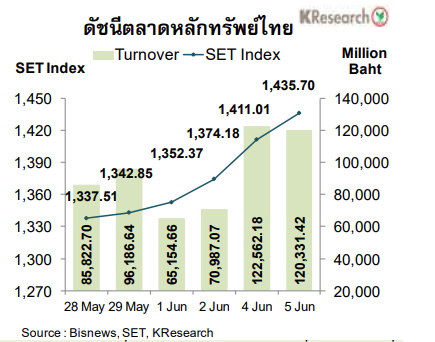 ส่วนความเคลื่อนไหวของตลาดหุ้นไทย หุ้นไทยปิดปลายสัปดาห์ที่ระดับสูงสุดในรอบกว่า 3 เดือน โดยดัชนี SET ปิดที่ระดับ 1,435.70 จุด เพิ่มขึ้น 6.91% จากสัปดาห์ก่อน ขณะที่มูลค่าการซื้อขายเฉลี่ยต่อวันอยู่ที่ 94,758.83 ล้านบาท เพิ่มขึ้น 21.97% จากสัปดาห์ก่อน ส่วนดัชนี mai เพิ่มขึ้น 3.38% จากสัปดาห์ก่อน มาปิดที่ 294.49 จุด