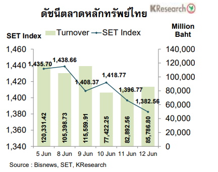 สำหรับสัปดาห์ถัดไป (15-19 มิ.ย.) บริษัทหลักทรัพย์กสิกรไทย จำกัด มองว่า ดัชนีหุ้นไทยมีแนวรับที่ 1,370 และ 1,350 จุด ขณะที่แนวต้านอยู่ที่ 1,400 และ 1,420 จุด ตามลำดับ โดยปัจจัยสำคัญที่ต้องติดตาม ได้แก่ ความคืบหน้าการพิจารณามาตรการกระตุ้นภาคการท่องเที่ยว รวมถึงสถานการณ์โควิด-19 ทั้งในและต่างประเทศ ส่วนข้อมูลเศรษฐกิจสหรัฐฯ ที่สำคัญ ได้แก่ ยอดค้าปลีก ผลผลิตภาคอุตสาหกรรม และตัวเลขการเริ่มสร้างบ้านเดือนพ.ค. ขณะที่ ปัจจัยต่างประเทศที่สำคัญอื่นๆ ได้แก่ การประชุมนโยบายการเงินของธนาคารกลางญี่ปุ่นและธนาคารกลางอังกฤษ ดัชนีราคาผู้บริโภคเดือนพ.ค. ของญี่ปุ่น และยูโรโซน รวมถึงยอดค้าปลีก ผลผลิตภาคอุตสาหกรรมและการลงทุนในสินทรัพย์ถาวรเดือนพ.ค. ของจีน
