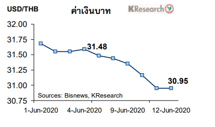 ศูนย์วิจัยกสิกรไทย สรุปความเคลื่อนไหวของค่าเงินบาทว่า เงินบาทแข็งค่าทะลุแนว 31.00 ไปแตะระดับแข็งค่าสุดในรอบกว่า 4 เดือนที่ 30.83 บาทต่อดอลลาร์ฯ โดยการแข็งค่าของเงินบาทในช่วงต้นสัปดาห์สอดคล้องกับสถานะซื้อสุทธิพันธบัตรไทยของนักลงทุนต่างชาติ ประกอบกับคาดว่ามีแรงขายเงินดอลลาร์ฯ จากกลุ่มผู้ส่งออก และผลจากปัจจัยทางเทคนิคที่ทำให้เงินบาทแข็งค่าต่อเนื่องในระหว่างสัปดาห์ นอกจากนี้เงินดอลลาร์ฯ ยังเผชิญแรงขาย หลังเฟดย้ำสัญญาณผ่อนคลายนโยบายการเงินต่อเนื่อง พร้อมกับประเมินแนวโน้มเศรษฐกิจสหรัฐฯ หดตัวรุนแรงถึง 6.5% ในปีนี้ อย่างไรก็ดีช่วงแข็งค่าของเงินบาทเริ่มจำกัดในช่วงปลายสัปดาห์ เนื่องจากตลาดรอติดตามท่าทีการเข้าดูแลค่าเงินของธปท. อย่างใกล้ชิด
