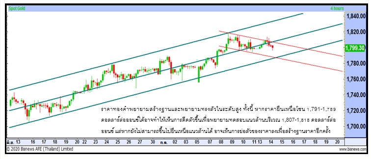ปัจจัยที่กล่าวมาหนุนให้ราคาทองคำทะยานขึ้นทำระดับสูงสุดบริเวณ 1,813.44 ดอลลาร์ต่อออนซ์ในระหว่างวัน อย่างไรก็ดี ราคาทองคำลดช่วงบวกในเวลาต่อมา จากแรงขายทำกำไรสินทรัพย์ปลอดภัยในวงกว้าง ทั้งทองคำ สกุลเงินดอลลาร์ รวมถึงพันธบัตรรัฐบาลสหรัฐ ขานรับข่าวดีที่สำนักงานอาหารและยาสหรัฐ (FDA) ได้ให้สถานะ “fast track” แก่บริษัท “ไฟเซอร์-BioNTech” ในการทดลองวัคซีนต้านไวรัส COVID-19 ทำให้ทางบริษัทได้รับการผ่อนคลายกฎระเบียบจาก FDA และส่งผลให้การพัฒนาวัคซีนเป็นไปอย่างรวดเร็วมากขึ้น ด้านกองทุน SPDR ถือครองทองเพิ่ม +3.51 ตัน