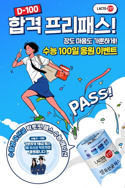 1등 유산균 ‘락토핏’이 수능100일을 맞아 수험생에게 꼭 맞는 수험생 전용 유산균 ‘락토핏 생유산균 패스’ 특별 에디션을 증정하는 수능100일 응원 이벤트를 진행한다고 25일 밝혔다.
