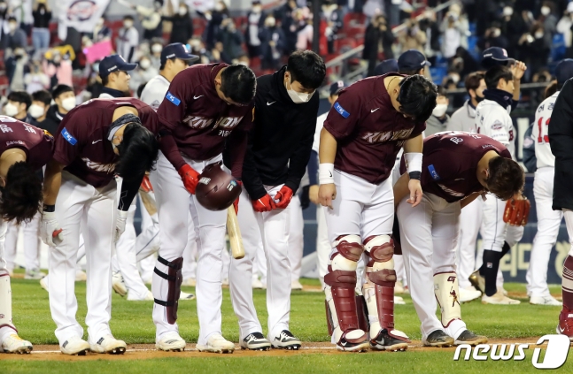 | 키움 선수단이 30일 두산전 패배 직후 팬들에게 인사를 하고 있다. /사진=뉴스1 |