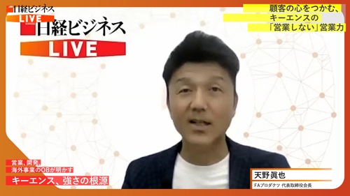 日経ビジネスLIVEではキーエンスの「強さの根源」を解き明かすため、3人の同社OBを講師に招いたウェビナーシリーズ(全3回)を開催した。5月19日の第1回に登壇したのは、FAプロダクツの天野眞也代表取締役会長。キーエンスへ1992年に入社し、20年近くに及んだ在籍期間で社長直轄プロジェクトなどを複数率いた「営業」のプロだ。「顧客の心をつかむ、キーエンスの『営業しない』営業力」をテーマにした講演を、アーカイブ動画とともにお伝えする。